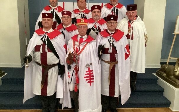 Der strahlend weiße Mantel, gesäumt mit einem markanten roten Kragen und verziert mit einem schottischen Templerkreuz, wurde persönlich vom Großmeister angelegt und gebunden. In gedämpften Tönen ernannte der Großmeister „Scotty“ persönlich zu seinem Kommandanten der Garde und beförderte ihn zum Eminenten Ritter.