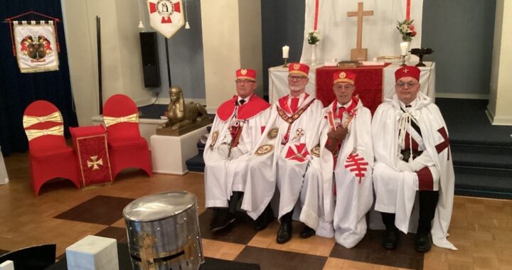 Der Tempel war vorbereitet, die Ritter in strahlend weißen Mänteln gekleidet, und Pilgrim Nr. 5 unter der Leitung von SE Kt Oberstleutnant a.D. Mick McCarthy eröffnete den Tempel.